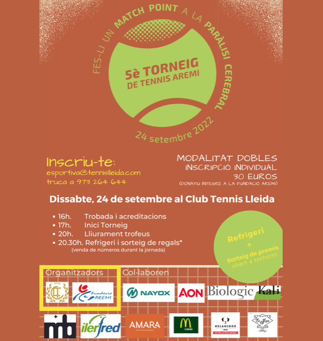 Per col·laborar amb aquesta bona causa, tot i que el torneig és disputarà en la modalitat de dobles (masculins i femenins, sense límit d’edat), els participants s’hauran d’inscriure a títol individual a través del correu esportiva@tennislleida.com o a la recepció del club. El preu de les inscripcions és de 30 euros, una quantitat que es donarà íntegrament a Aremi.