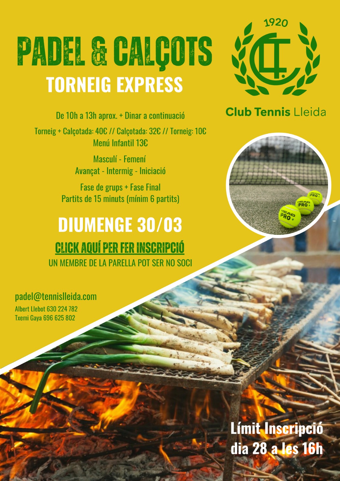 El Club Tennis Lleida celebrarà el diumenge 30 de març el Torneig Express Pàdel & Calçots, una jornada esportiva i lúdica que oferirà un menú esportiu i gastronòmic d’allò més complet.