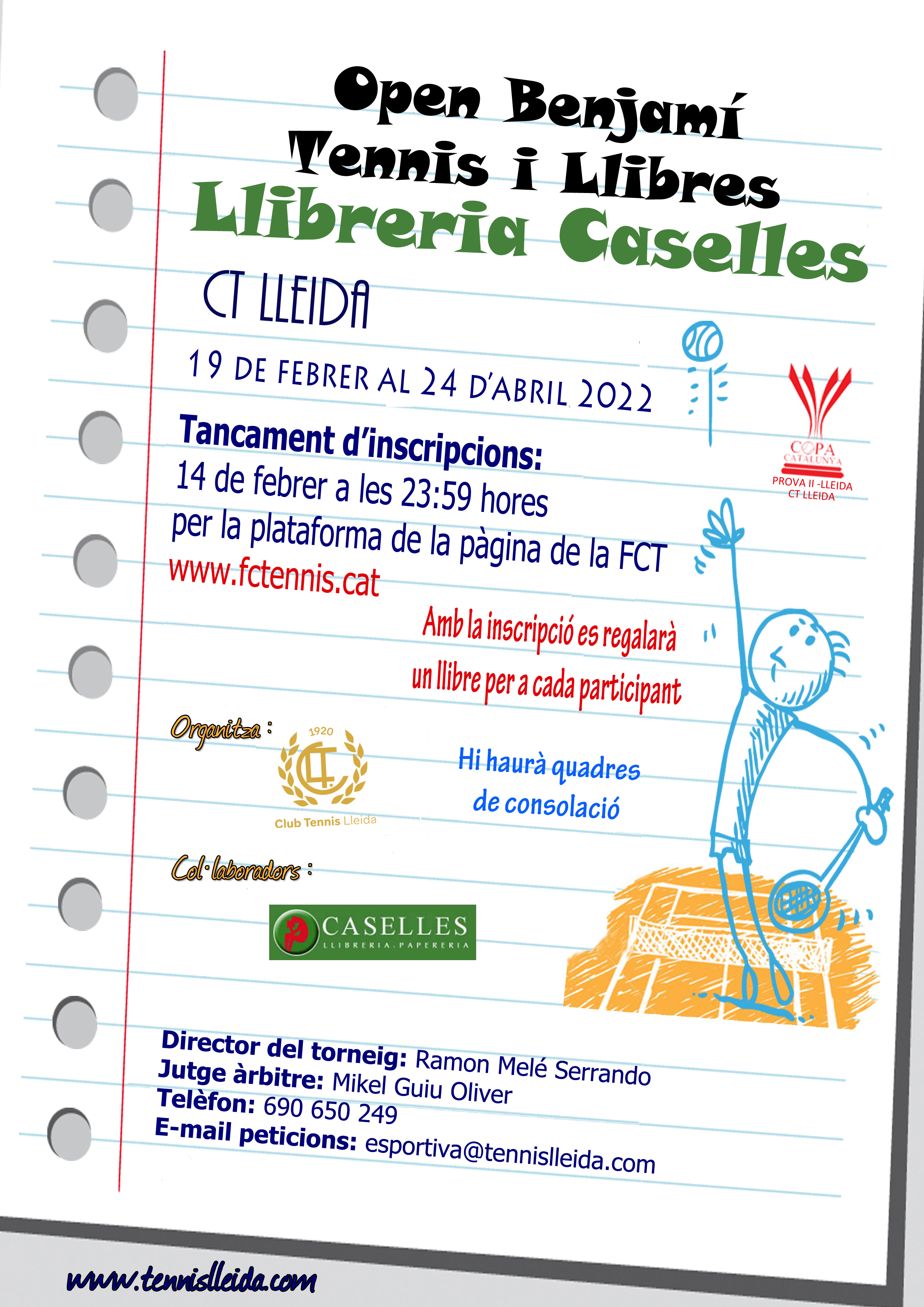 L’Open Benjamí Tennis i Llibres-Llibreria Caselles, del 19 de febrer al 27 d’abril al CT Lleida