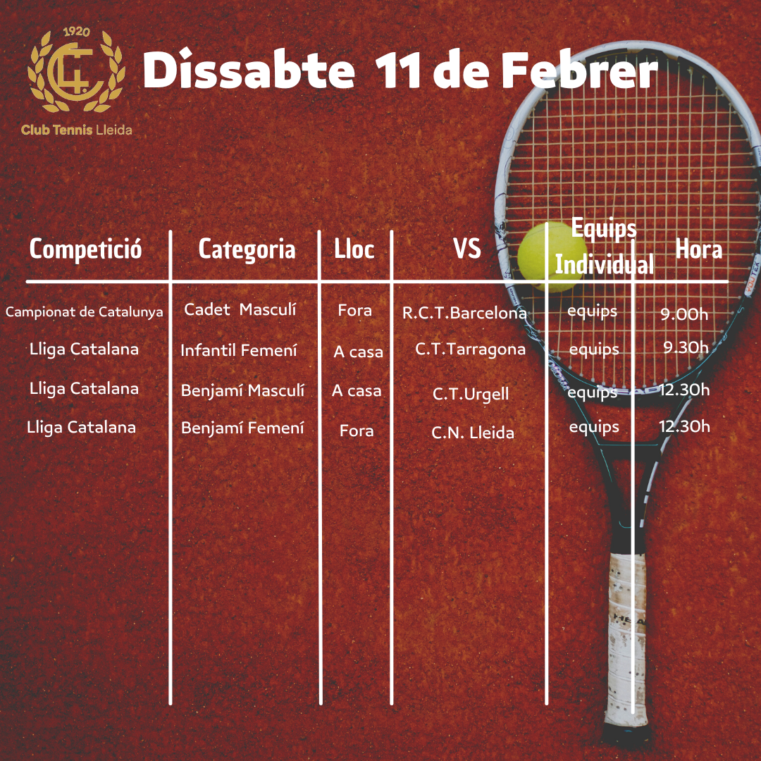 Quadre de competicions dels equips de tennis del CT Lleida per al cap de setmana dels dies 11 i 12 de febrer
