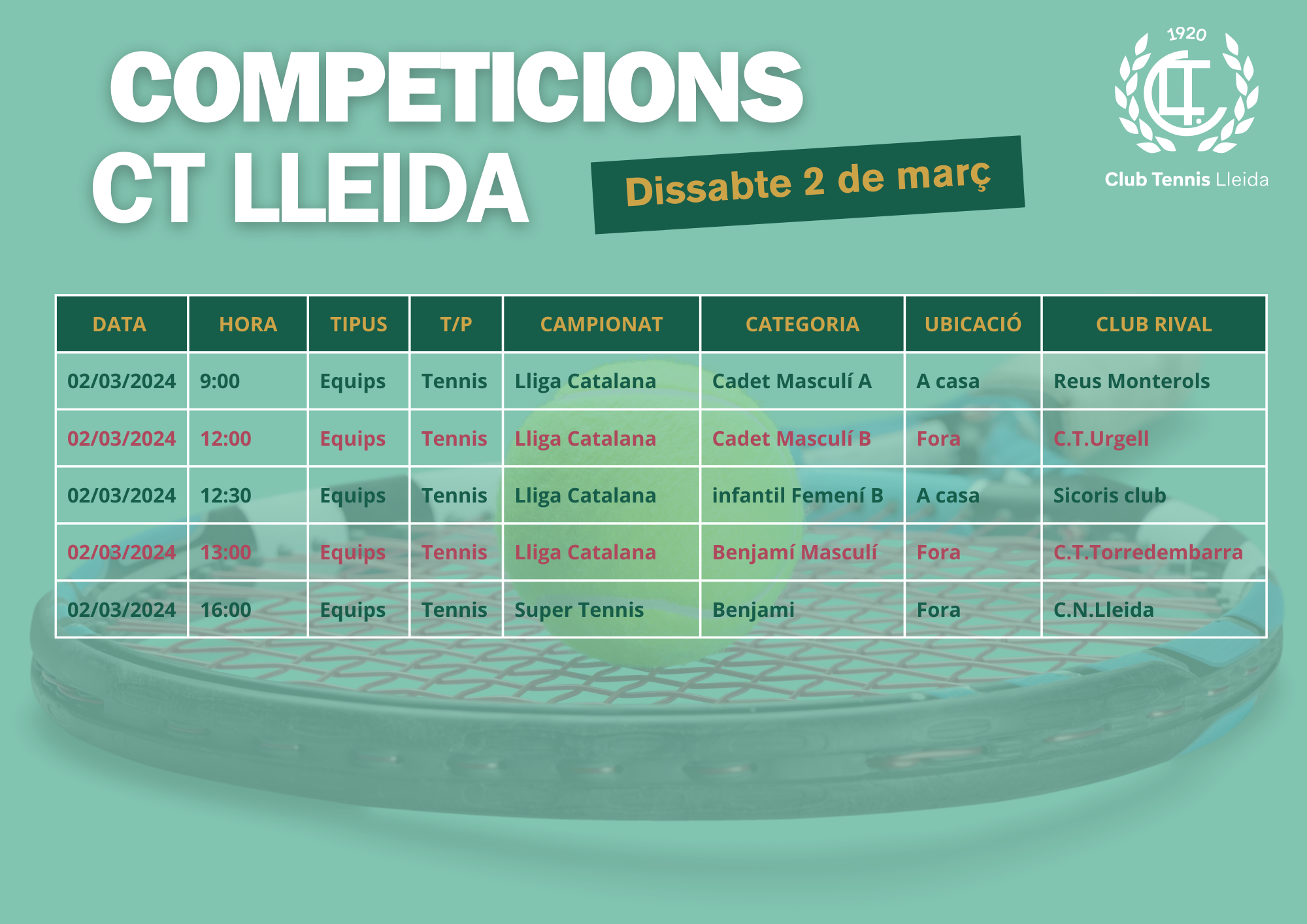 Quadre de competicions dels equips de tennis del CT Lleida per al cap de setmana dels dies 2 i 3 de març