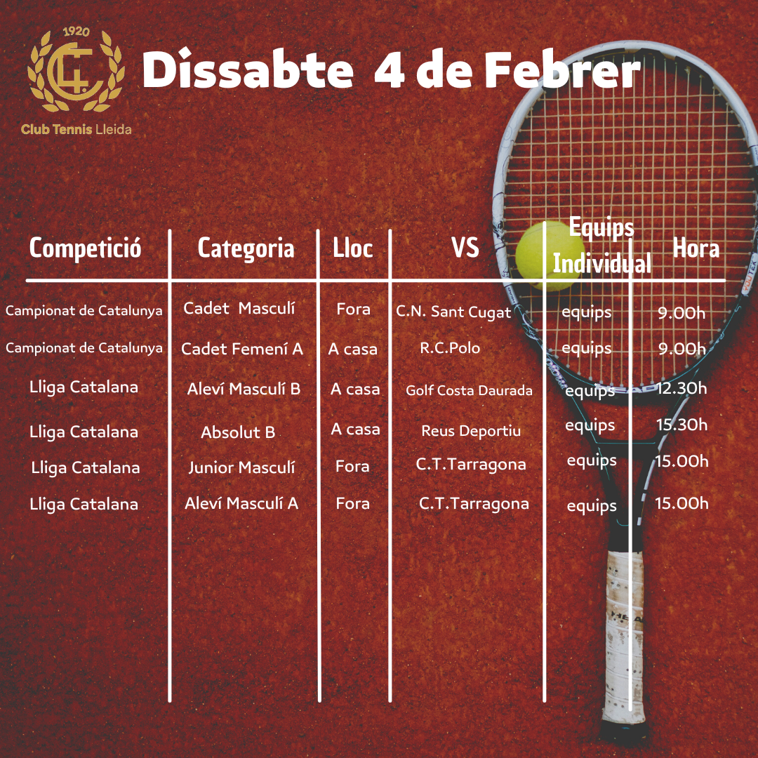 Quadre de competicions dels equips de tennis del CT Lleida per al cap de setmana dels dies 4 i 5 de febrer