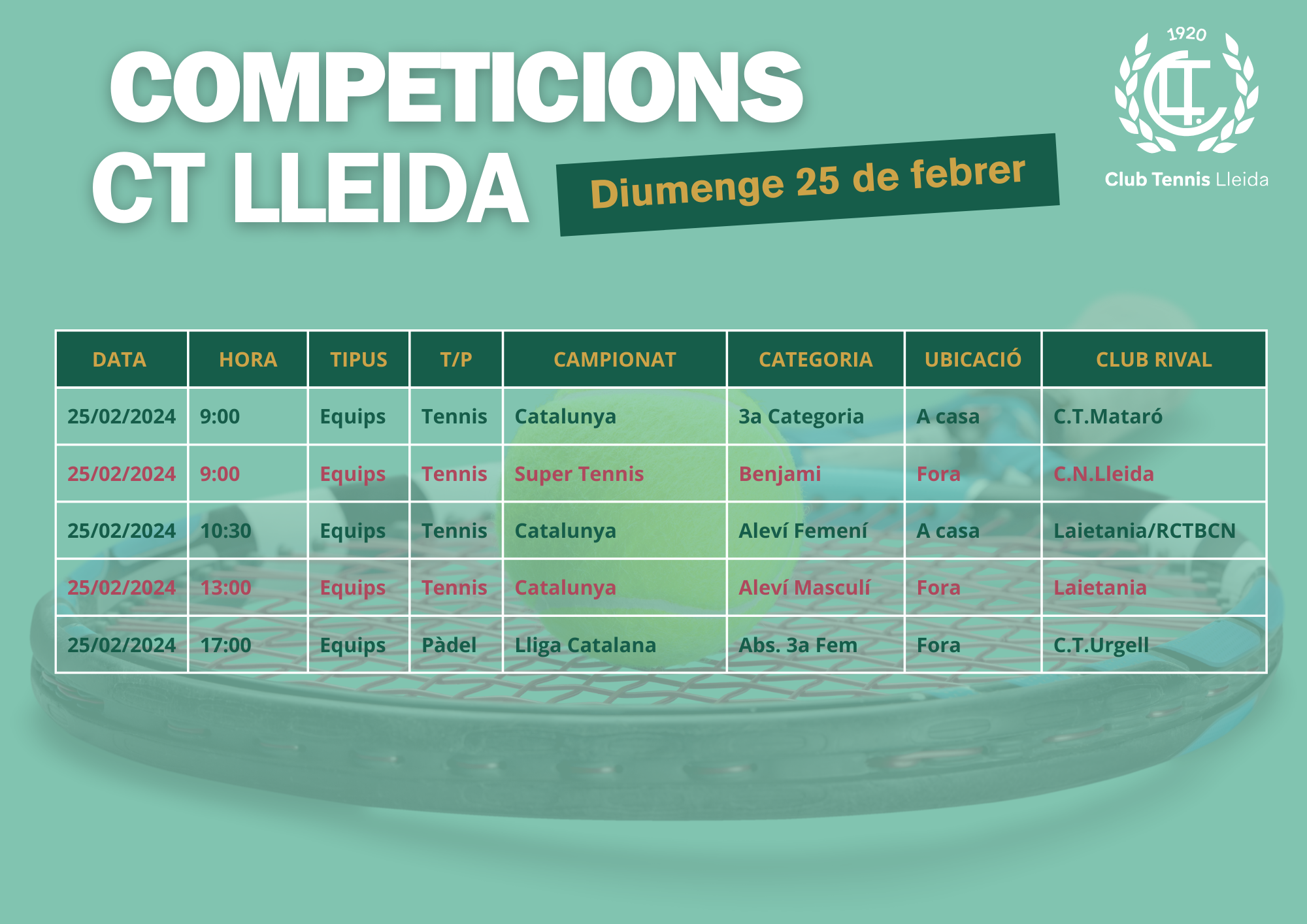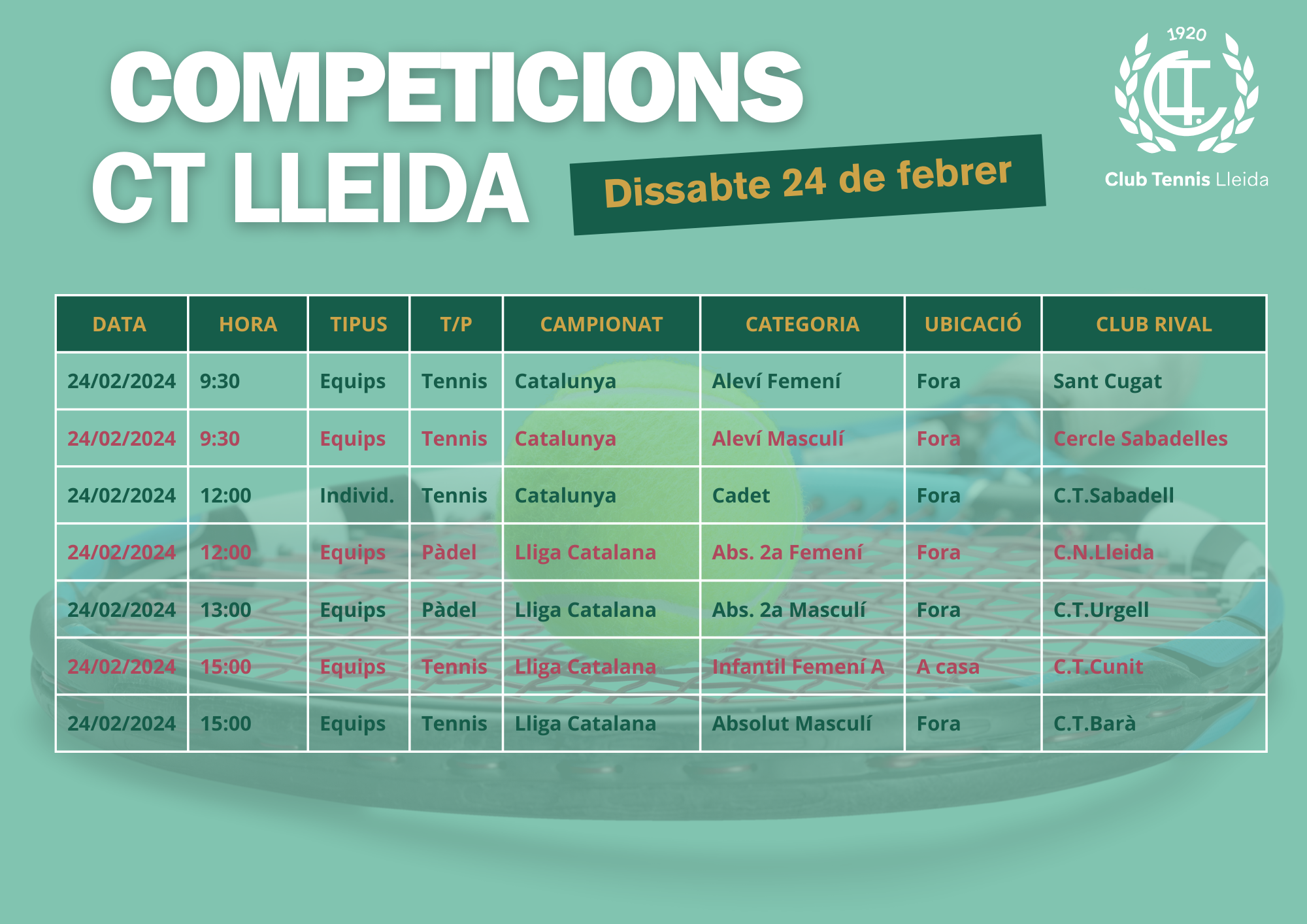 Quadre de competicions dels equips de tennis i pàdel del CT Lleida per al cap de setmana dels dies 23, 24 i 25 de febrer