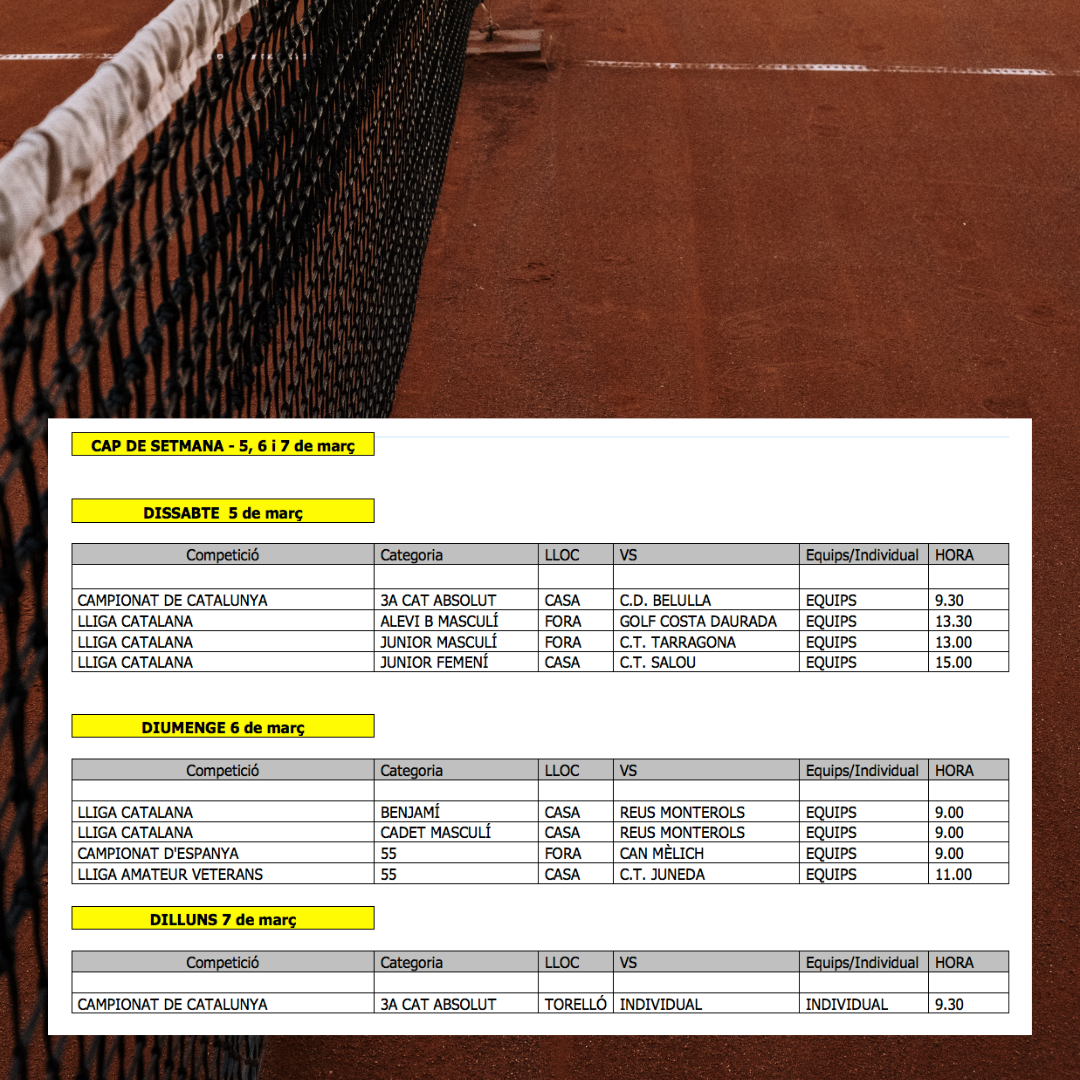 Quadre de competicions dels equips de tennis pel cap de setmana del 5-6 de març