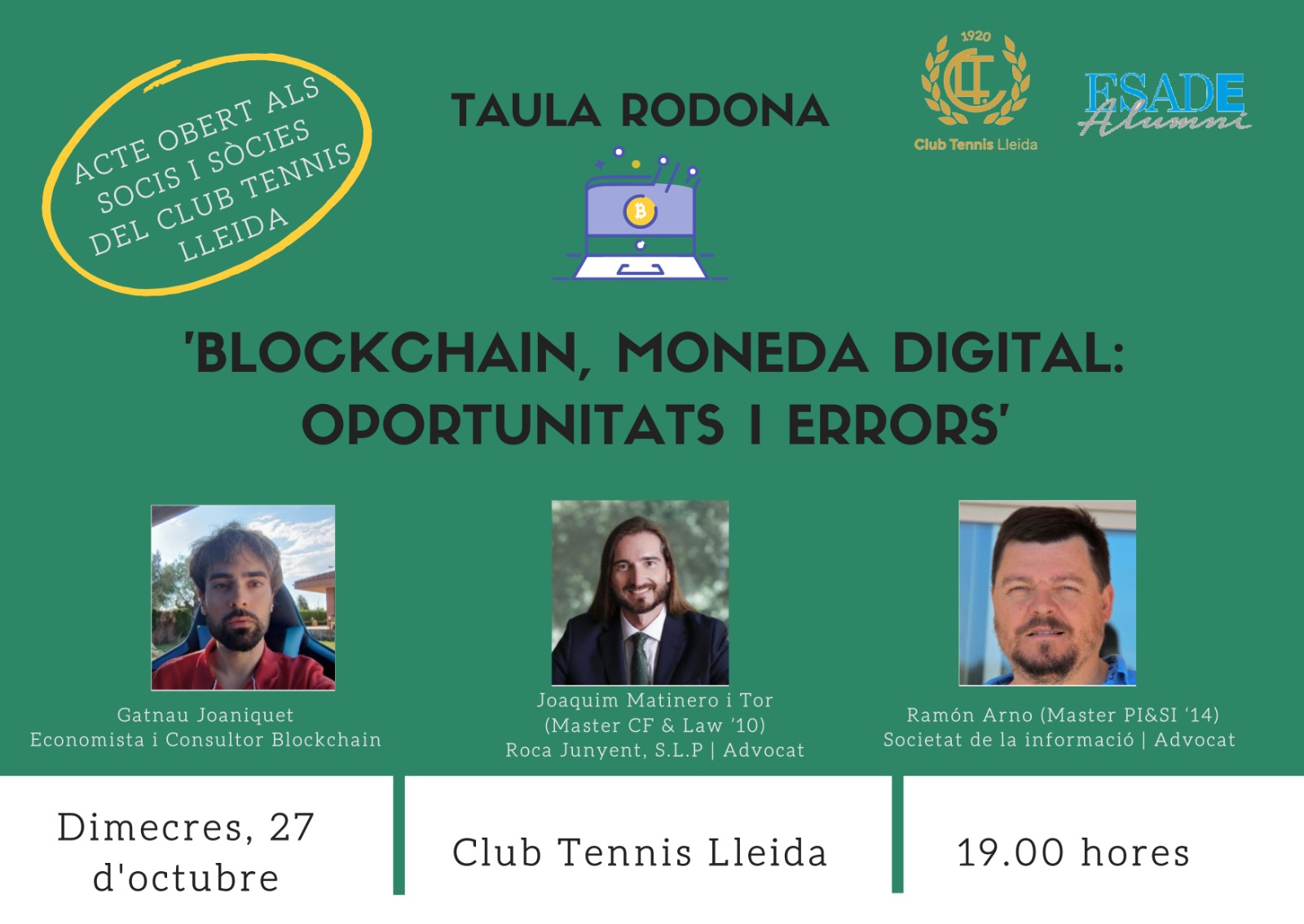 El Club Tennis Lleida serà l’escenari, el dimecres 27 d’octubre, de la taula rodona titulada ‘Blockchain, moneda digital: oportunitats i errors’, organitzada per Lleida ESADE Alumni. La jornada tindrà lloc a les 19.00 hores i es realitzarà de forma presencial, oberta per als socis/es del CT Lleida.